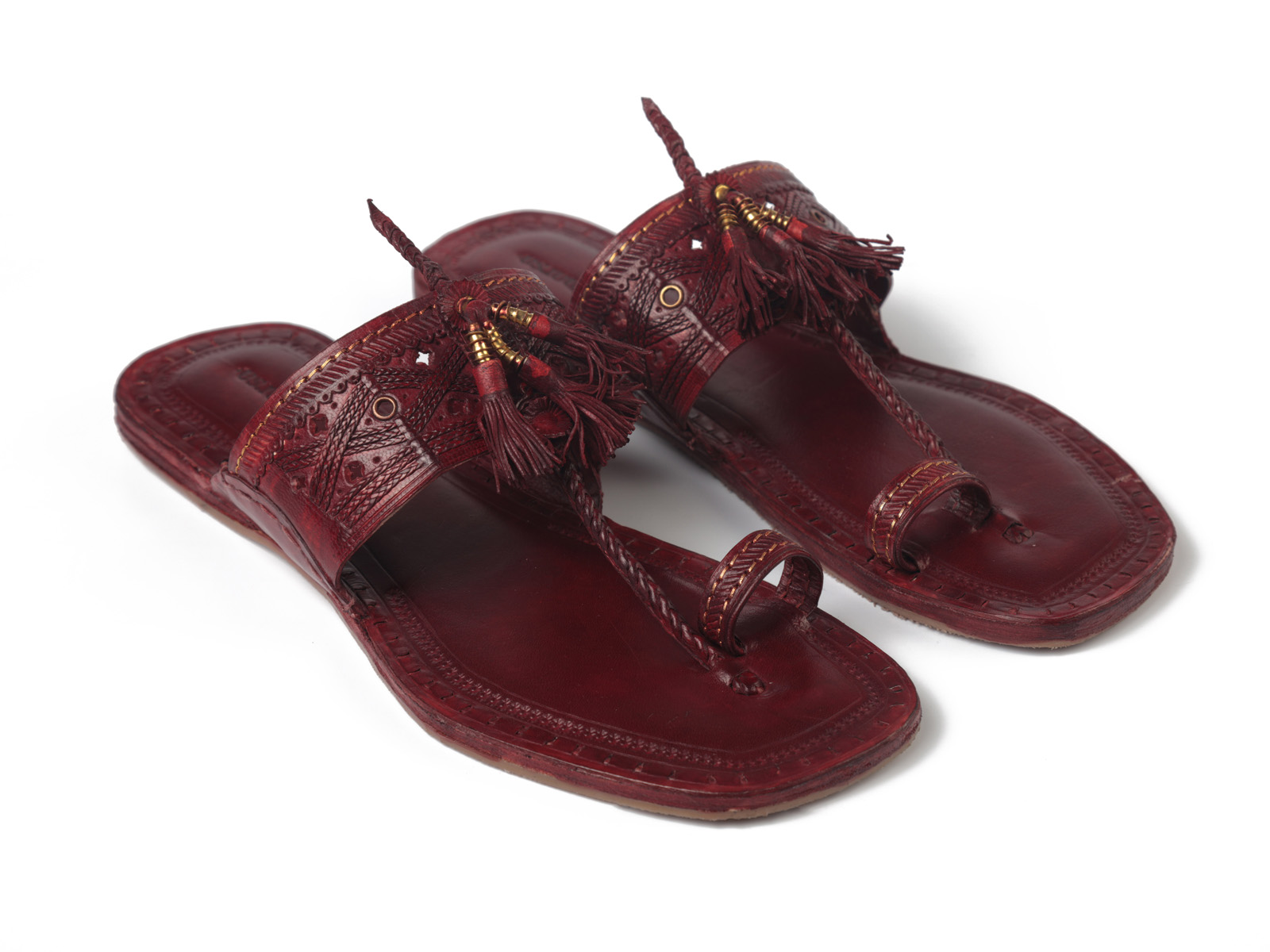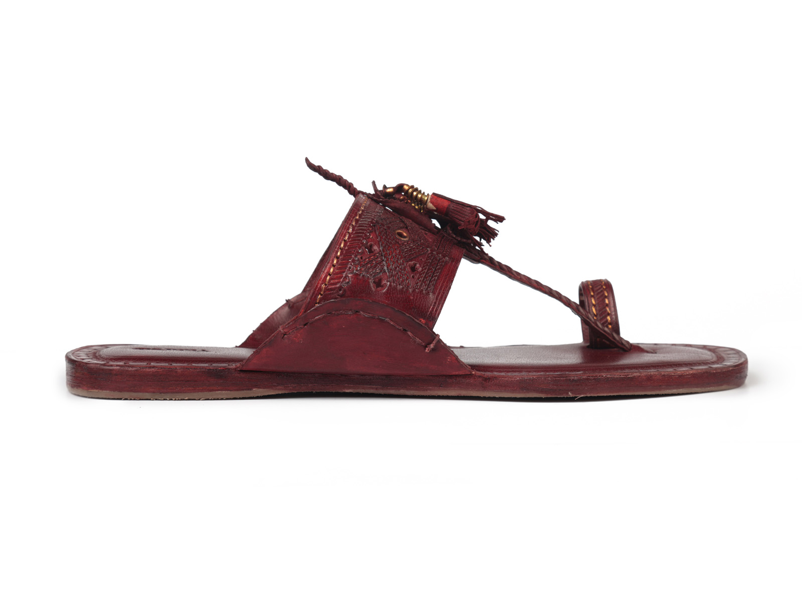 The Legacy Footwear by Vaarsa – Mens Burgandy Kolhapuri Chappal with Cross Design of Fine Leather Braids and Pom-Pom on Upper, Flat Tip Shape, Cushioned Bottom with Manual Leather Chord Stitching and Anti-Slip TPR at Bottom